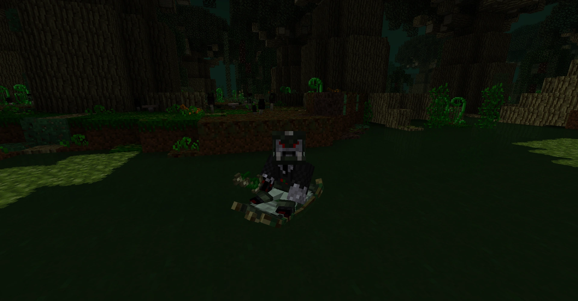 The Lurker Skin Raft controls identically to the vanilla Boat, using the normal directional keys to move and turn and preventing the player from looking directly behind themselves. The raft has an advantage over the Weedwood Rowboat in that it is easier to deploy and control; however, it is slower and does not protect against attacks by mobs from below. It also cannot be used as a shield in this form. It is worth noting that the Lurker Skin Armor bonus gives faster movement speed underwater than the raft.