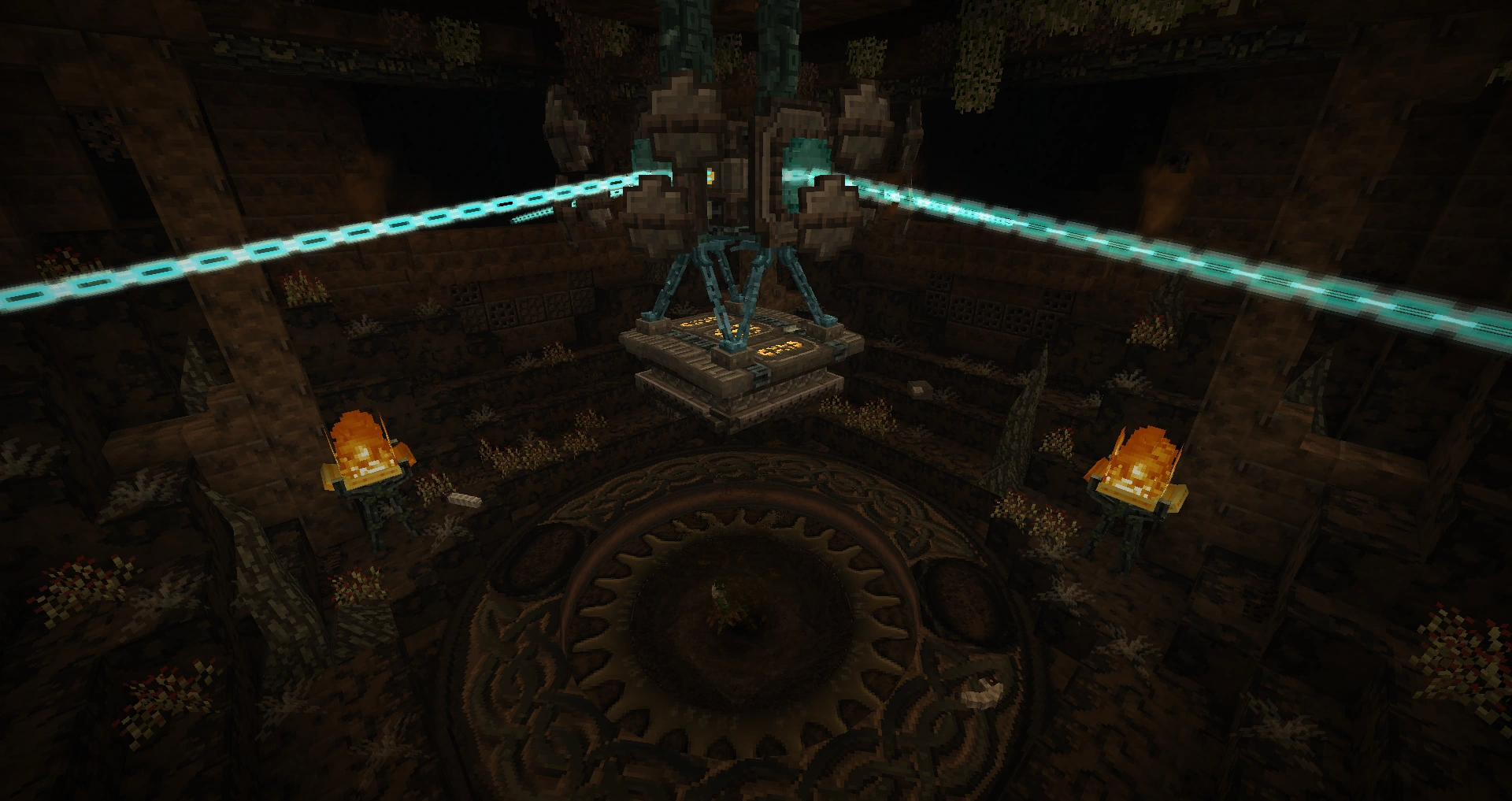 When they reach the bottom of the Sludgeon, the player will encounter a large mechanism suspended by chains, protected by flying shields, with a big, spinning gear shaped platform below it that will spin the player if stood on. In the middle of the gear is a big hole that continuously spawns Leech, Termites, Smoll Sludges, and Large Sludge Worms. On each side of the room are balconies, and below that, a wall made of Spike Traps. On each balcony there are two Sludge Jet Turrets that continuously respawn on either end, and lenses in the middle that shoot out a chain-shaped beam into the mechanism's lenses.